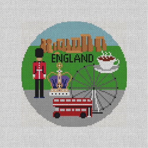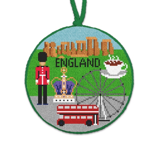 When you gather around the tree this holiday season, enjoy the ornaments that you have stitched reflecting the travels your family has experienced together! This ornament canvas features England with: the London Eye, a double decker bus, the Crown Jewels, a Beefeater, a charming cup of tea, and historic Stonehenge. (DMC embroidery floss is optional, does not include finishing materials) Check out our blog post with more travel destination ideas: https://www.needlepaint.com/blog/2020/09/15/travel-round-needlepoint-ornament/If you would like our designers to create a custom travel ornament especially for you, go to: https://www.needlepaint.com/needlepoint-kits/custom-vacation-needlepoint-ornament-canvas-1384