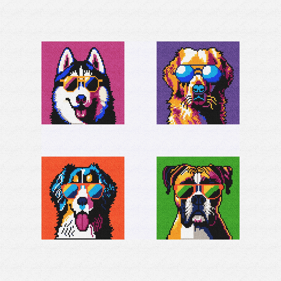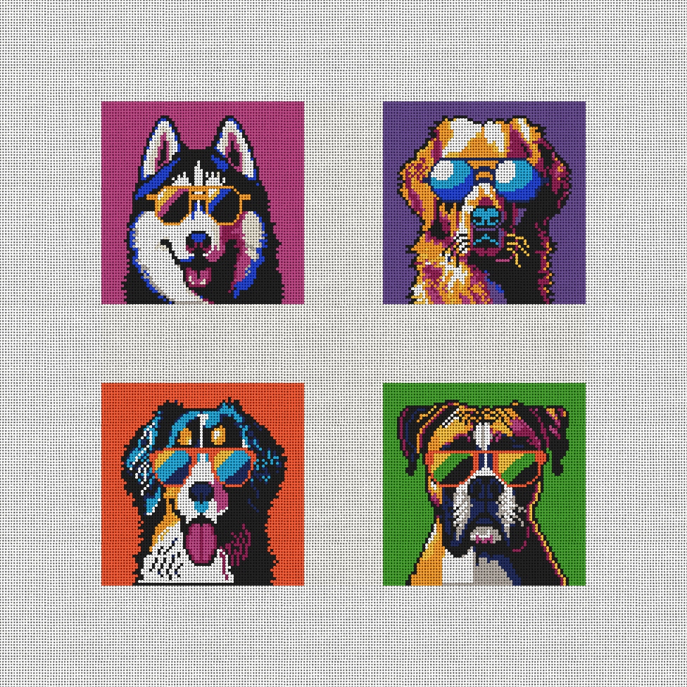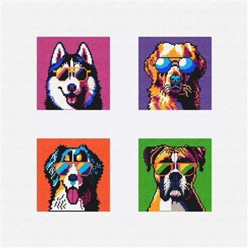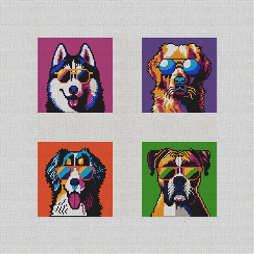 Meet four fabulous dogs, who enjoy life with tails wagging and hearts brimming with love. Together, they're not just dogs - they're a pop art masterpiece bursting with color and charm, ready to steal your heart! Fun to stitch and finish as a coaster set, or as an ornament set for your holiday tree. (DMC embroidery floss is optional, does not include finishing materials)
