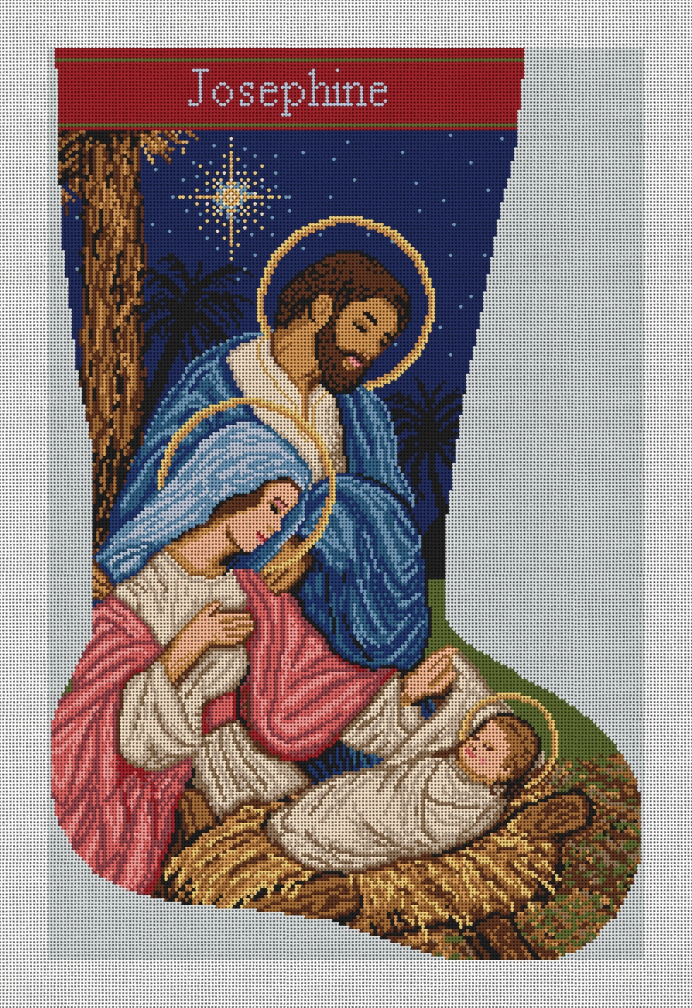 This needlepoint stocking design captures the essence of the Christmas story; featuring Mary, Joseph and the baby Jesus who represent the serenity and beauty of this Holy Night. Use your needlepoint artistry to create a hand crafted masterpiece which will become a cherished holiday keepsake! (DMC thread is optional, does not include finishing materials) (GG)