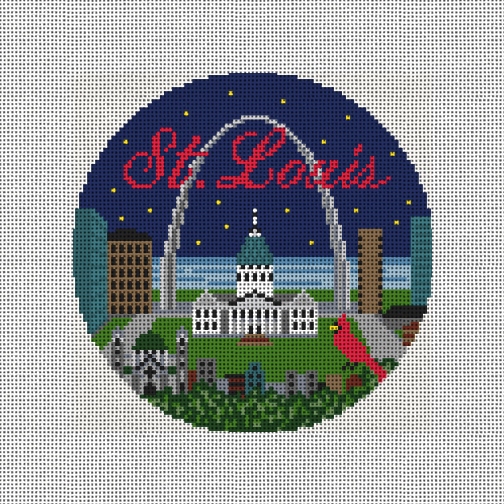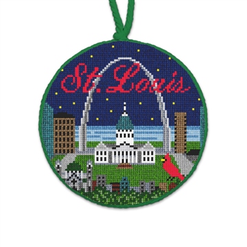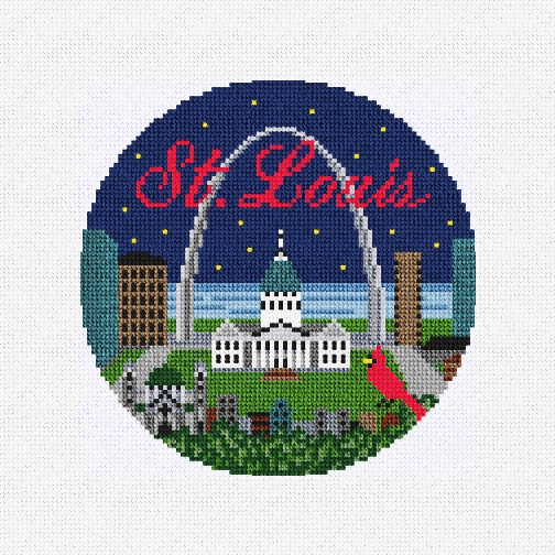 Nestled near the confluence of the Mississippi and Missouri rivers, St. Louis offers an abundance of exciting adventures and attractions to explore. This ornament canvas features images of: the Gateway Arch, the St. Louis Missouri Capitol building, St. Louis Cathedral, cityscape and a red cardinal as a nod to their favorite sports team. When you gather around the tree this holiday season, enjoy the ornaments that you have stitched reflecting the travels your family has experienced together. (DMC embroidery floss is optional, does not include finishing materials)