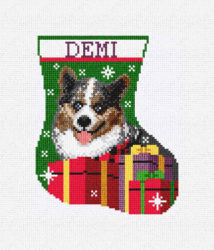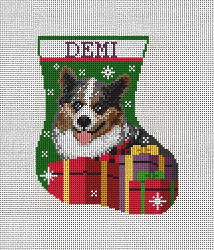 This little dog has such a sweet affectionate personality! Including your Corgi when celebrating the holidays, is what makes Christmas special! Create lasting holiday memories by stitching this personalized needlepoint mini stocking ornament canvas and add some extra personality to your holiday tree! (DMC embroidery floss is optional, does not include backing or edging)