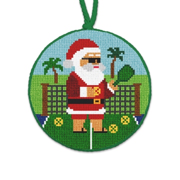 Santa has the moves in this game of Pickleball! Opa! Add this whimsical pickleball themed needlepoint ornament to your holiday decor, it's a must have for any pickleball enthusiast's holiday collection.