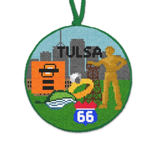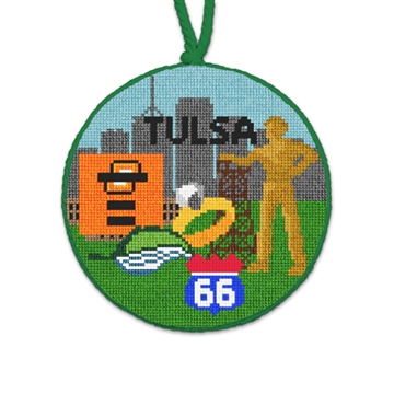 The Oil Capital of the World! When you gather around the tree this holiday season, enjoy the ornaments that reflect the travels your family has experienced together. Our Tulsa Oklahoma ornament includes images of: the Golden Driller, Route 66 sign, the OSU building with logo, the Tulsa skyline and the Riverside Park logo.