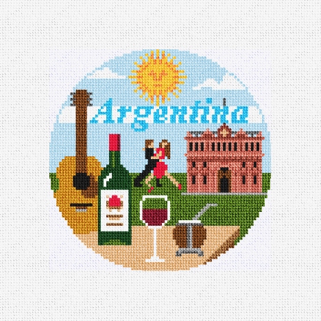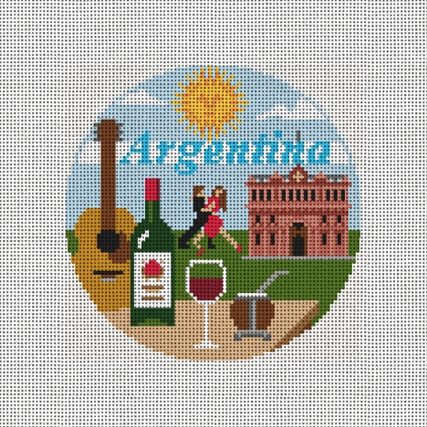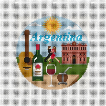 Renowned for its passion for soccer, tango music, dancing and literary tradition; Argentina is a blend of natural beauty and cultural richness. This ornament canvas design features: tango dancers, guitar, wine, maté, Argentine sun crest, and Casa Rosada. When you gather around the tree this holiday season, enjoy the needlepoint ornaments that you have stitched reflecting the travels your family has experienced together. (DMC embroidery floss is optional, does not include finishing materials)