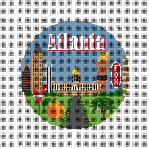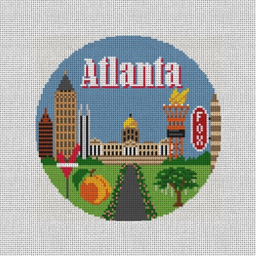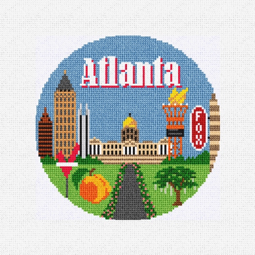 Atlanta, Georgia is a family friendly city known for their amazing musical heritage, and fabulous peaches! This ornament canvas features images of: the Centennial Torch, Varsity Burger sign, the Georgia state capitol, a peach, an oak tree, the downtown Bank of America Plaza, and the Fox Theater. When you gather around the tree this holiday season, enjoy the ornaments that you have stitched reflecting the travels your family has experienced together. (DMC embroidery floss is optional, does not include backing or edging)