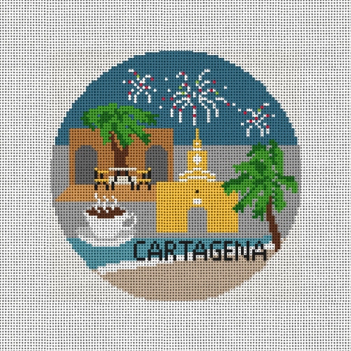 Enjoy the ornaments that you have hand stitched reflecting the travels your family has experienced together! Stitch and adorn your Christmas tree with this colorful Cartagena, Columbia ornament canvas including images of: fireworks, a beach scene, Carmen restaurant, wall and clock tower, and a delightful cup of steaming coffee. (DMC embroidery floss is optional, does not include finishing materials) If you would like our designers to create a custom travel ornament especially for you, go to: https://www.needlepaint.com/needlepoint-kits/custom-vacation-needlepoint-ornament-canvas-1384