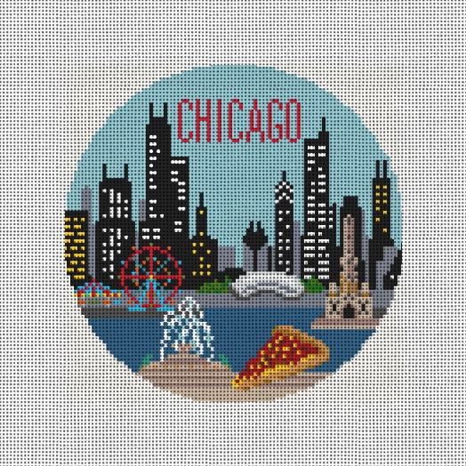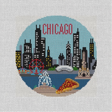 The Windy City! When you gather around the tree this holiday season, enjoy the ornaments that you have stitched reflecting the travels your family has experienced together. Our Chicago ornament canvas includes images of: the city skyline, Willis Tower, the Bean (Cloud Gate), Buckingham Fountain, Navy Pier, the Water Tower, and a slice of deep dish pizza. (DMC embroidery floss is optional, does not include finishing materials) If you would like our designers to create a custom travel ornament especially for you, go to: https://www.needlepaint.com/needlepoint-kits/custom-vacation-needlepoint-ornament-canvas-1384