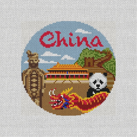 The People's Republic of China is a vast and varied country with a rich history and ancient sites; a must see on any travel itinerary. This ornament canvas design features: the Forbidden City, Great Wall, Terracotta Warrior, dragon dance and a panda. Bring your favorite travel adventures to life -- one stitch at a time! (DMC embroidery floss is optional, does not include finishing materials)