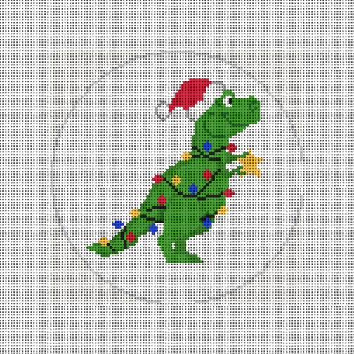 Big, scary, extinct . . . . and basically really cool! Playful and awkward, this little dinosaur is always willing to help put up the Christmas decorations. He may however, need a little help getting those lights untangled. A great canvas to stitch for your holiday tree, or the perfect small canvas on which to teach someone how to needlepoint. When gathering around the tree this holiday season, enjoy the ornaments that you have lovingly handmade! (DMC embroidery floss is optional, does not include backing or edging)