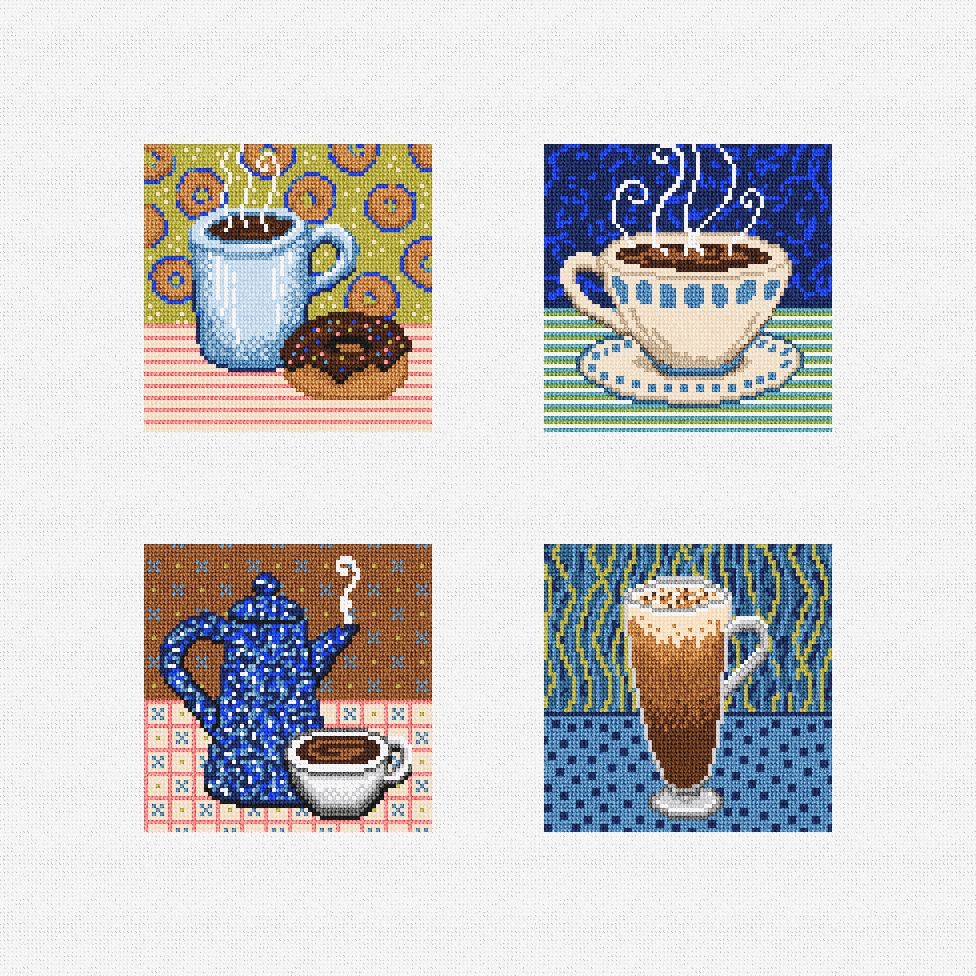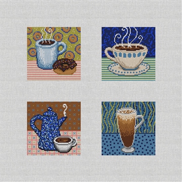 Black coffee! Café au lait! Espresso! Mocha latte! Stitch, sip and create -- transforming your favorite daily brews into needlepoint. Finish as a coaster set or ornaments for your holiday tree. (DMC embroidery floss is optional, does not include finishing materials)