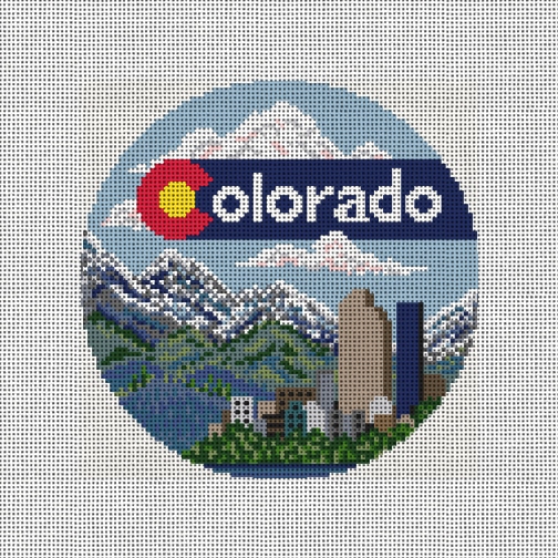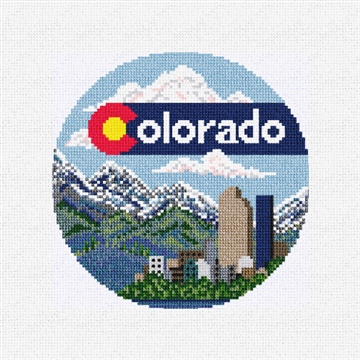 Colorful Colorado! This needlepoint ornament canvas features the downtown Denver cityscape with the spectacular backdrop and breathtaking views of the Rocky Mountains. When you gather around the tree this holiday season, enjoy the ornaments that you have stitched reflecting the travels your family has experienced together. (DMC embroidery floss is optional, does not include backing or edging)