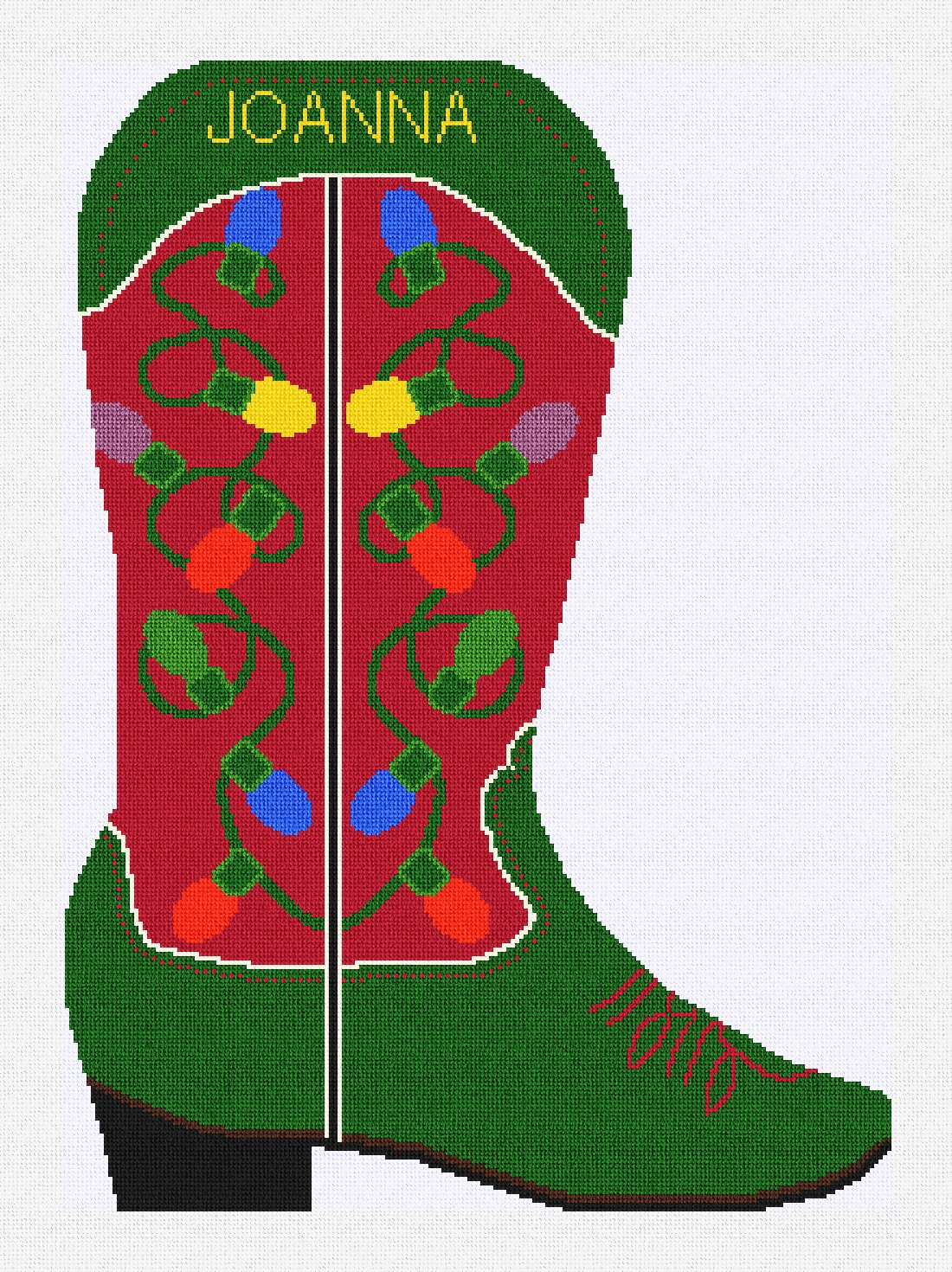 A boot by the fire, shiny and bright -- ready for Christmas on a starry night! Ho-ho-howdy, the season is here, stitch and fill up your holiday boot with goodies and gear! (DMC embroidery floss optional, does not include finishing materials) GG