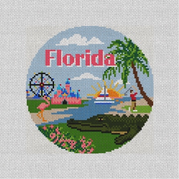Warm and vibrant, the "sunshine state" never disappoints! This Florida ornament features: the Wheel at Icon Park, a flamingo, alligator, Cinderella Castle, a sailboat, golfer, palm tree and plenty of sunshine. When you gather around the tree this holiday season, enjoy the ornaments that you have stitched reflecting the travels your family has experienced together! (DMC embroidery floss is optional, does not include finishing materials)