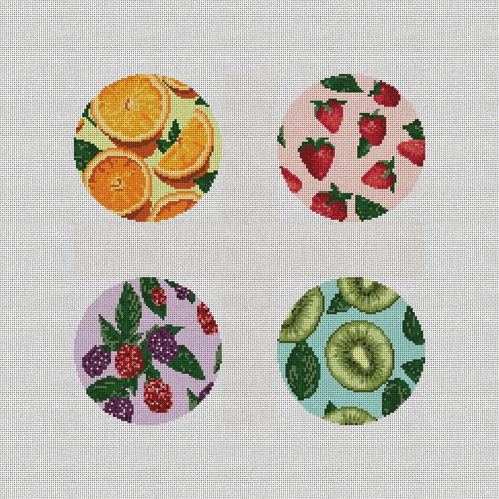 Fresh new day, fresh fruit, fresh stitch! Add a splash of freshness under your drink and to your decor. Fun to stitch and finish as a circular coaster set or refreshing new ornaments for your holiday tree. (DMC embroidery floss is optional, does not include finishing materials)