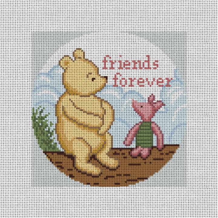 "We will be friends until forever, just you wait and see." Winnie the Pooh and Piglet share a little quiet quality time together. A needlepoint collection we know you'll enjoy stitching for this year's Christmas holiday; inspired by the adorable insights and amusing thoughts of Winnie the Pooh and his friends, from the classic storybook author A.A. Milne. (DMC embroidery floss is optional, does not include finishing materials)