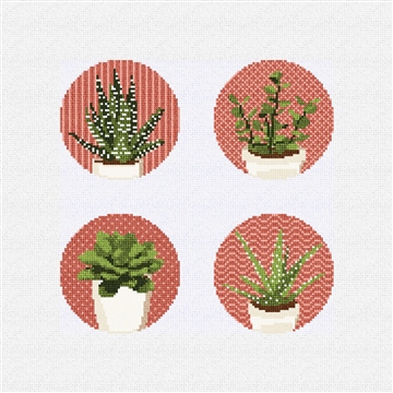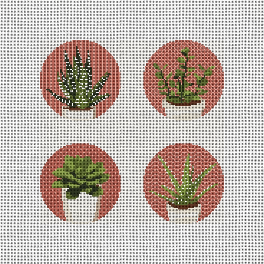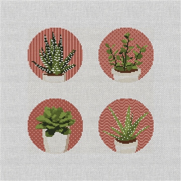 Bring the calming, desert-inspired charm of these resilient and beloved succulents into your living space! These hardy succulents include: Zebra Plant, Crassula Orata, Echeveria, and Aloe Vera. Enjoy stitching this needlepoint kit and finish them as a coaster set or beautiful ornaments for your holiday tree. (DMC embroidery floss is optional, does not include finishing materials)