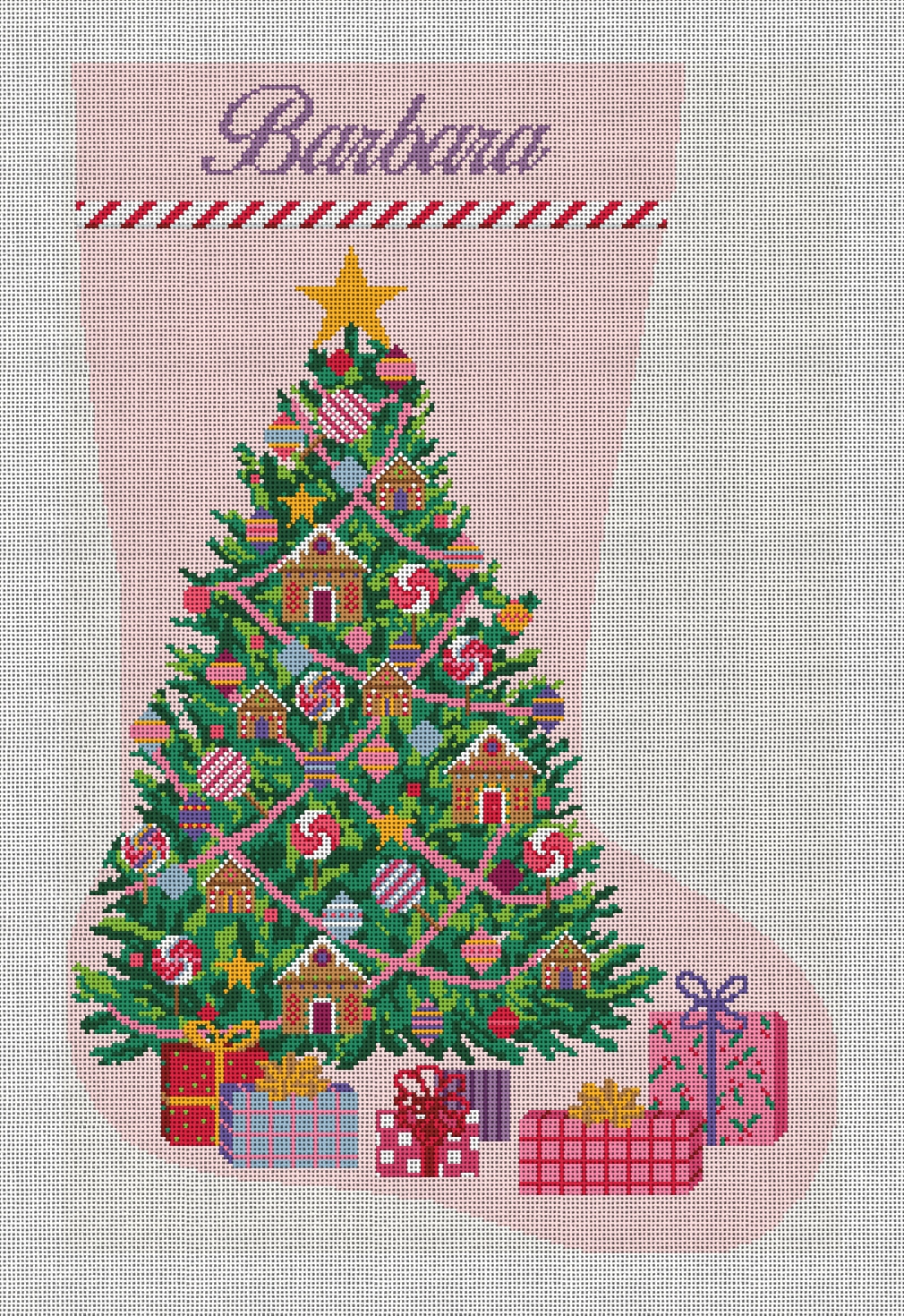Home sweet gingerbread home -- whimsical gingerbread houses gently dusted in "snow" and sparkling sweet treats turn this stocking into a deliciously festive display! Good times, laughter and plenty of joy, the holidays are extra fun when good friends are near. Needlepoint, decorate, celebrate, repeat. (DMC embroidery floss optional, does not include finishing materials.)