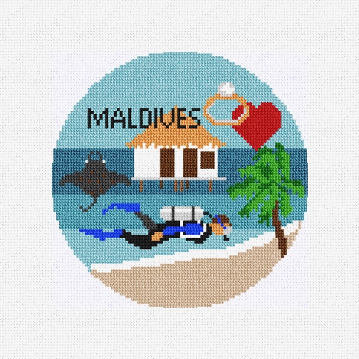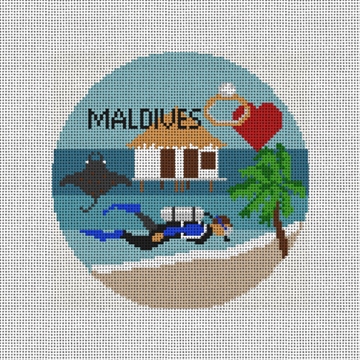 Enjoy the ornaments that you have stitched reflecting the travels your family has experienced together! Stitch and adorn your Christmas tree with this festive Maldives ornament canvas including: a manta ray, scuba diver, an over the water hut, a palm tree, beach, and a diamond ring with heart. (DMC embroidery floss is optional, does not include finishing materials) If you would like our designers to create a custom travel ornament especially for you, go to: https://www.needlepaint.com/needlepoint-kits/custom-vacation-needlepoint-ornament-canvas-1384