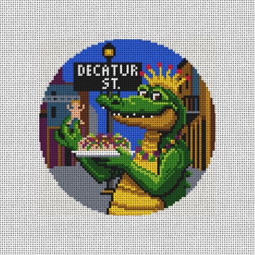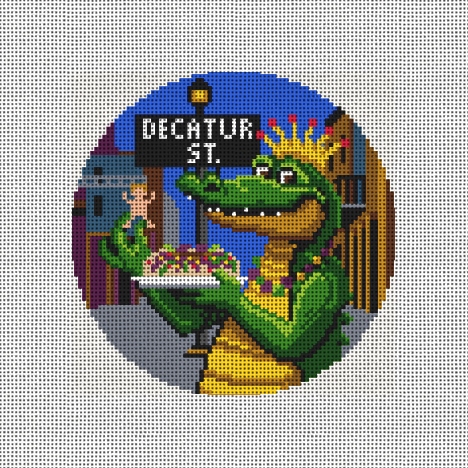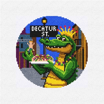 Slice by slice and grin by grin, this gator's king cake hides a baby within! Whimsy meets tradition, when playful needlepoint designs and festive colors turn every ornament into a mini Mardi Gras moment. Stitch a little magic. (DMC embroidery floss is optional, does not include finishing materials)