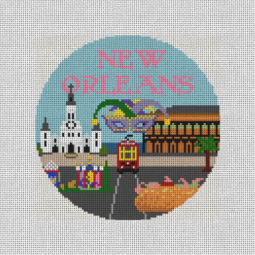 The Big Easy! When you gather around the tree this holiday season, enjoy the ornaments that you have stitched reflecting the travels your family has experienced together. Our New Orleans ornament canvas includes images of: St. Louis Cathedral, the French Quarter, Mardi Gras mask and float, po' boy sandwich and a street car. (DMC embroidery floss is optional, does not include finishing materials) If you would like our designers to create a custom travel ornament especially for you, go to: https://www.needlepaint.com/needlepoint-kits/custom-vacation-needlepoint-ornament-canvas-1384