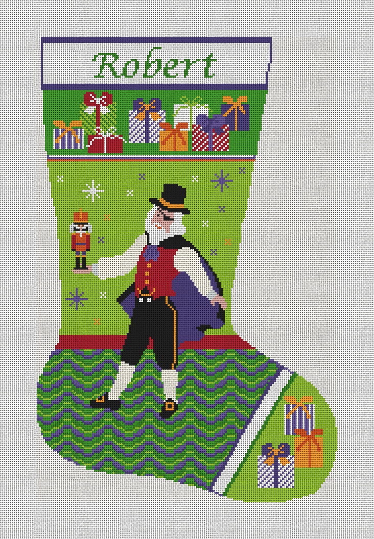 Herr Drosselmeyer is a magician-like figure, with cape and eye patch. A character of great mystery and intrigue. In the Nutcracker Suite story, Herr Drosselmeyer is known as Clara's grandfather (depending on which version of the story you are familiar with, he is sometimes known as Clara's uncle or godfather). He arrives at the family holiday party with gifts for all, and for Clara he brings a wooden nutcracker in the shape of a little man. Our Herr Drosselmeyer needlepoint stocking, is a wonderful stocking to stitch for your fireplace; with or without the other character stockings from our Nutcracker Suite Christmas stocking set. (DMC embroidery floss is optional, does not include finishing materials)