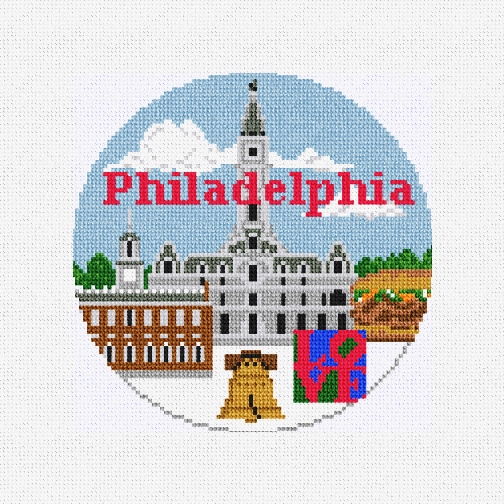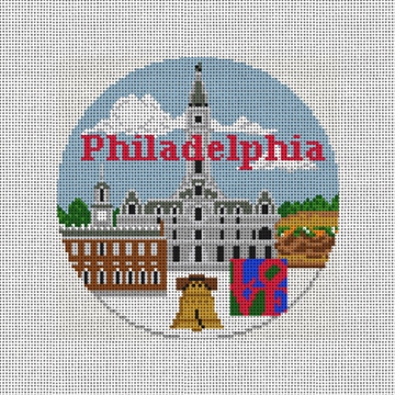 The "City of Brotherly Love" or Philadelphia, is a historical city packed with cultural richness and urban energy! This ornament canvas design features: City Hall, Independence Hall, the Love Sculpture, the Liberty Bell and a Philly cheese steak sandwich. When you gather around the tree this holiday season, enjoy the needlepoint ornaments that you have stitched reflecting the travels your family has experienced together. (DMC embroidery floss is optional, does not include finishing materials)