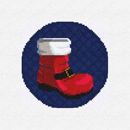 Those are some mighty big boots to fill -- Santa takes care of the Christmas holiday with such grace and style! This cute needlepoint Christmas ornament is a quick and fun project for the novice or expert stitcher. (DMC embroidery floss is optional, does not include backing or edging)