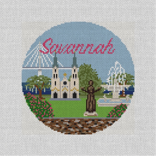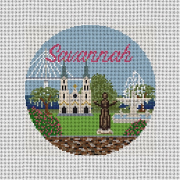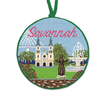 Savannah, Georgia is a beautiful southern city with incredible architecture, history and charming culture. This ornament canvas features images of: the Bird Girl statue, Fountain Forsyth Park, Talmadge Bridge, an oak tree with Spanish moss, azaleas, the Cathedral of St. John the Baptist, and cobblestone roads. When you gather around the tree this holiday season, enjoy the ornaments that you have stitched reflecting the travels your family has experienced together. (DMC embroidery floss is optional, does not include backing or edging)