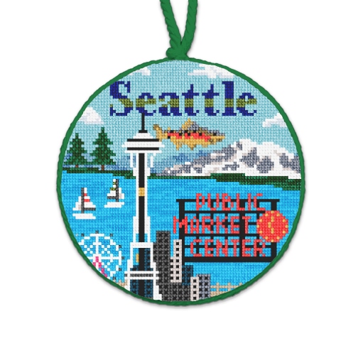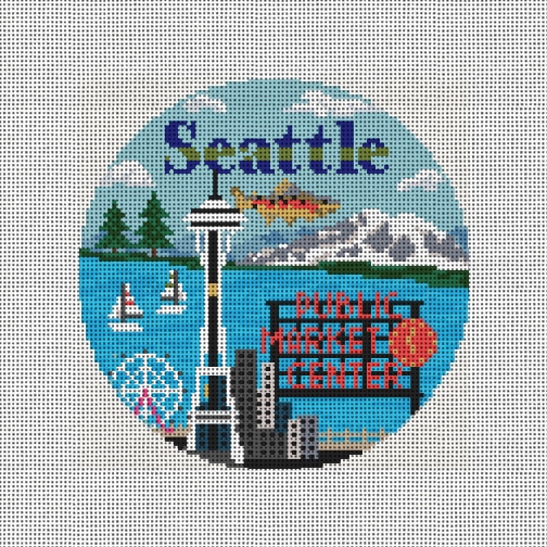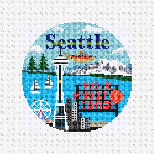 The beautiful Pacific Northwest! When you gather around the tree this holiday season, enjoy the ornaments that you have stitched reflecting the travels your family has experienced together. Our Seattle ornament canvas includes images of: a trout, sailboats, Pike Place Market, the Space Needle, Seattle Great Wheel, downtown Seattle and the docks, Puget Sound, Mount Rainier, the Cascade Mountains, and the name Seattle in the Seahawks colors. (DMC embroidery floss is optional, does not include backing or edging)