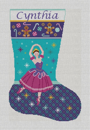 In the Nutcracker Suite, the Nutcracker turns into a prince and escorts Clara to the Land of Sweets. They are promptly greeted by the Sugar Plum Fairy. After she learns about their daring battle with the Mouse King and his mice, the Sugar Plum Fairy rewards Clara and the Prince with a celebration of dances. We've designed our Sugar Plum Fairy needlepoint stocking canvas so you can stitch the magic and beauty, which are conveyed in the Nutcracker Suite. This Sugar Plum Fairy Christmas stocking will sure to become a part of your holiday traditions. (DMC embroidery floss is optional, does not include finishing materials)