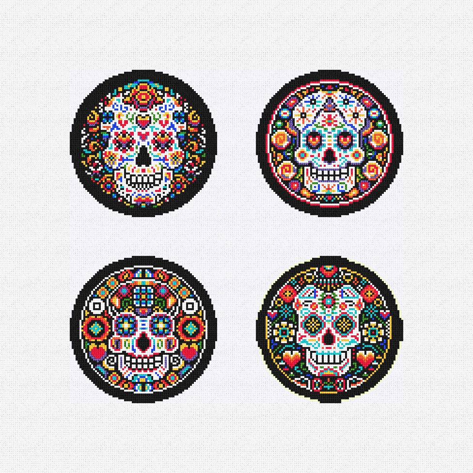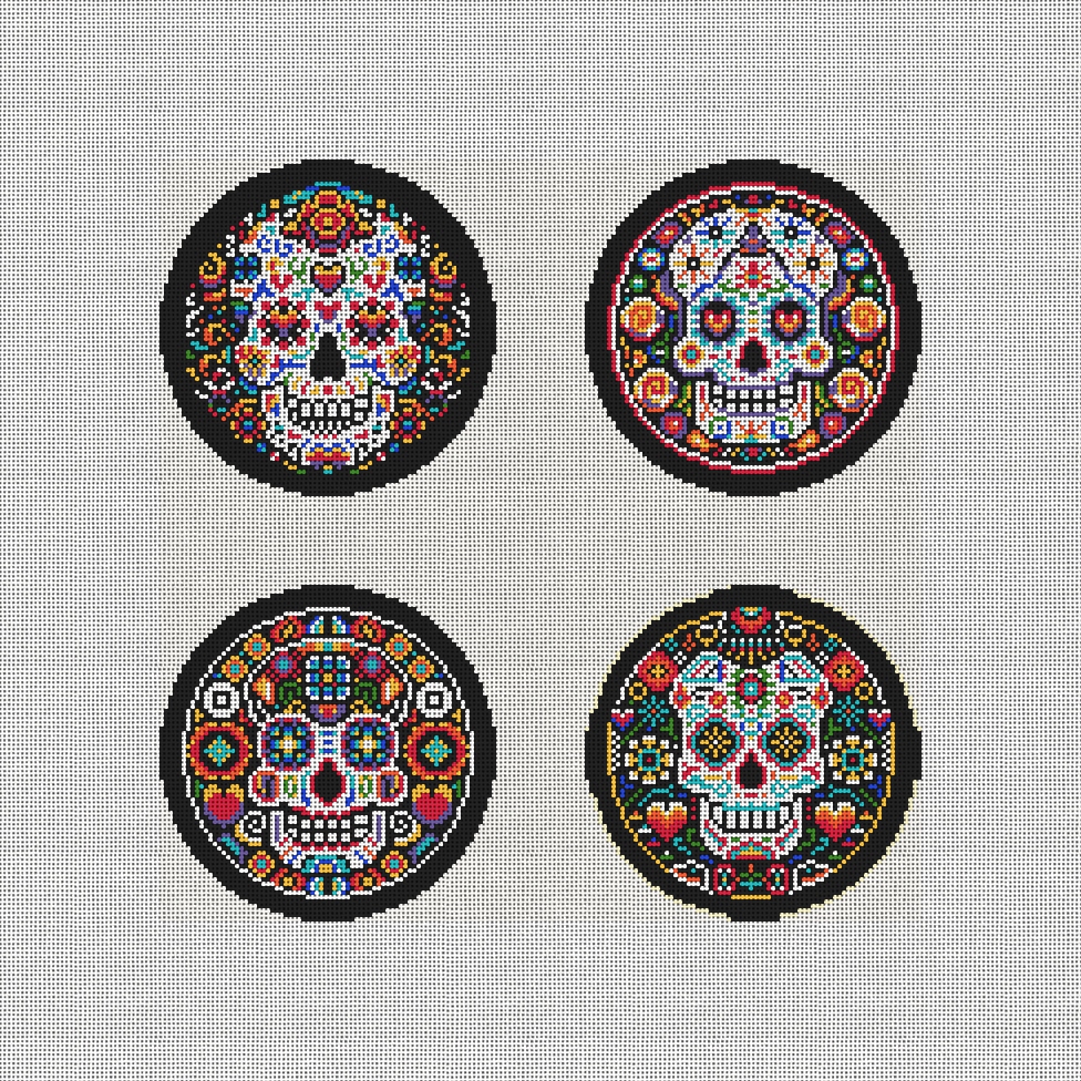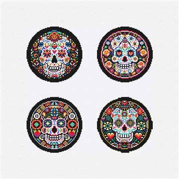 These four sugar skull needlepoint designs tell the vibrant traditional story of el Dia de los Muertos (Day of the Dead), where life and death dance together. This year stitch and celebrate with lively bold needlepoint colors, sugar skulls, and heartfelt remembrance of your loved ones! Finish as a coaster set or ornaments for your celebration. (DMC embroidery floss is optional, does not include finishing materials)