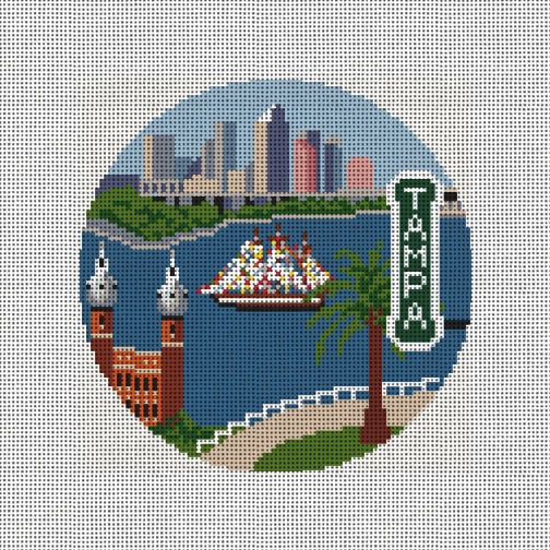 This ornament canvas features a stunning glimpse of Tampa Bay, with its large natural harbor! We've includes images of: the Tampa skyline, the Jose Gasparilla Pirate Ship, the Tampa Bay Hotel, and the Tampa Theatre sign. When you gather around the tree this holiday season, enjoy the ornaments that you have stitched reflecting the travels your family has experienced together. (DMC embroidery floss is optional, does not include backing or edging)