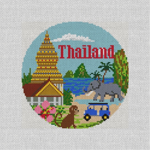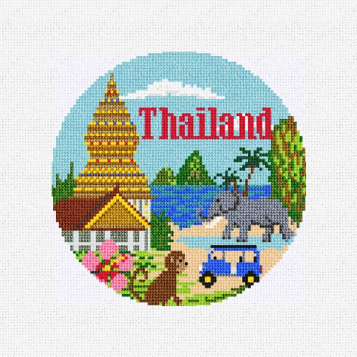 When you gather around the tree this holiday season, enjoy the Thailand ornament that you have stitched reflecting the travels your family has experienced together! This colorful Thailand Christmas ornament canvas features: the island beach with palm trees and hibiscus flower, a temple, elephant, monkey, and a tuk tuk. (DMC embroidery floss is optional, does not include finishing materials) Check out our blog post with more travel destination ideas: https://www.needlepaint.com/blog/2020/09/15/travel-round-needlepoint-ornament/If you would like our designers to create a custom travel ornament especially for you, go to: https://www.needlepaint.com/needlepoint-kits/custom-vacation-needlepoint-ornament-canvas-1384