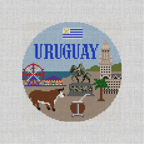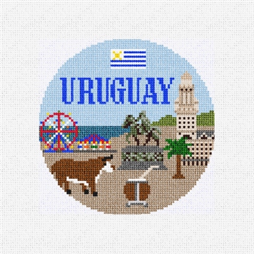 Known for its natural beauty, pristine beaches, historic towns and picturesque countryside, Uruguay has a rich cultural heritage. This ornament canvas design features: a representative of the cattle industry, maté, the carnival, beach, Plaza Independencia, and the Uruguay flag. When you gather around the tree this holiday season, enjoy the needlepoint ornaments that you have stitched reflecting the travels your family has experienced together. (DMC embroidery floss is optional, does not include finishing materials)
