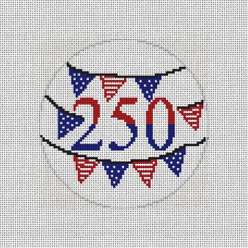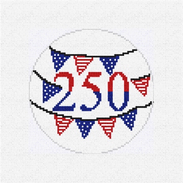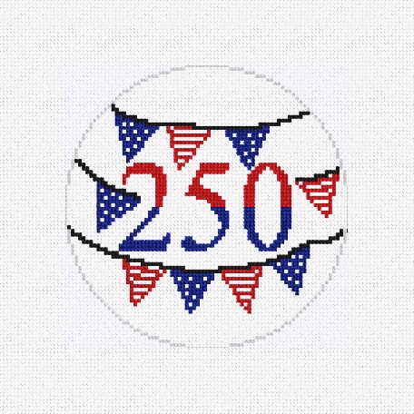 Three cheers for 250 years! From our sparkling red, white, and blue, needlepoint ornament collection honoring 250 years of American spirit, pride and timeless tradition. Stitch on! (DMC embroidery floss optional, does not include finishing materials)