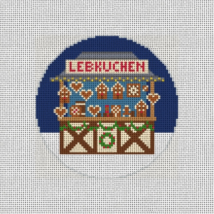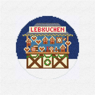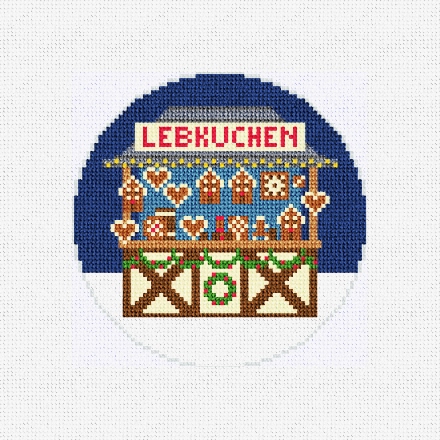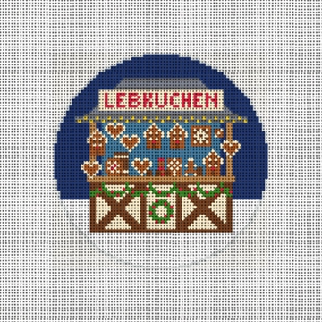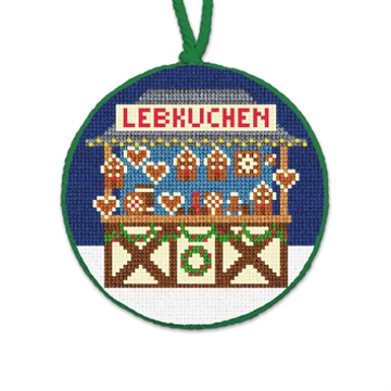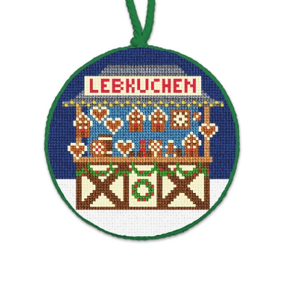 Lebkuchen -- gingerbread! Cinnamon kisses, cozy delight, German sweets baked just right. Wreaths, treats, and handmade art -- German Christmas markets warm the heart. Stitch the spirit of Christmas as it glows in each needlepoint ornament design. (DMC embroidery floss is optional, does not include finishing materials)