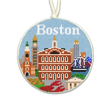 The charming historic metropolis of Boston is filled with culture and the perfect blend of tradition and modernity. This needlepoint ornament design features: Faneuil Hall, Quincy Market, Old North Church, the USS Constitution, and a lobster. When you gather around the tree this holiday season, enjoy the ornaments that reflect the travels your family has experienced together!