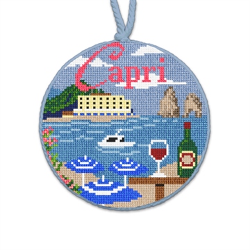 Savor the sparkle of Capri! Where sunsets paint the sea gold and every corner whispers of adventure and romance. Bring your favorite travel adventures to life -- with a beautifully crafted needlepoint ornament!