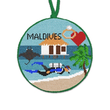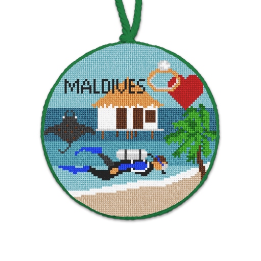 Enjoy the ornaments that reflect the travels your family has experienced together! Adorn your Christmas tree with this festive Maldives ornament including: a manta ray, scuba diver, an over the water hut, a palm tree, beach, and a diamond ring with heart.