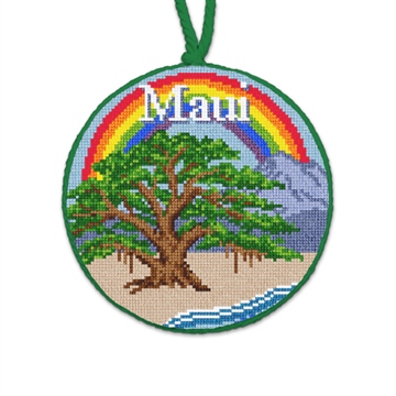 Lahaina's Banyan Tree has been a Maui cultural hub and community gathering space since 1873. This needlepoint ornament design features this famed Banyan Tree, Haleakala - the east Maui volcano, and a rainbow as a symbol of hope. Commemorate your treasured family travels, or those adventures which have yet to be explored. We will donate 20% of this purchase to the Maui Food Bank.