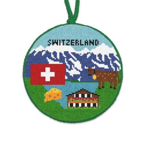 Enjoy the ornaments that reflect the travels your family has experienced together! Adorn your Christmas tree with this colorful Switzerland ornament including: snow capped Alps, Lake Lucerne, cheese, a cow with bell, the Swiss flag, and a wooden alpine home with charming flowers.