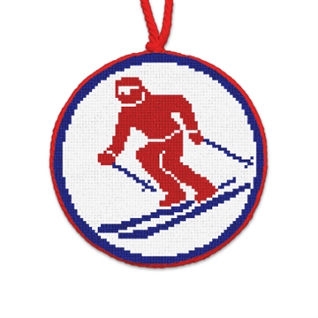 Racing the mountain in a blur of snow and speed -- downhill skiing! Frosty fun needlepointed with the thrill of winter competition.